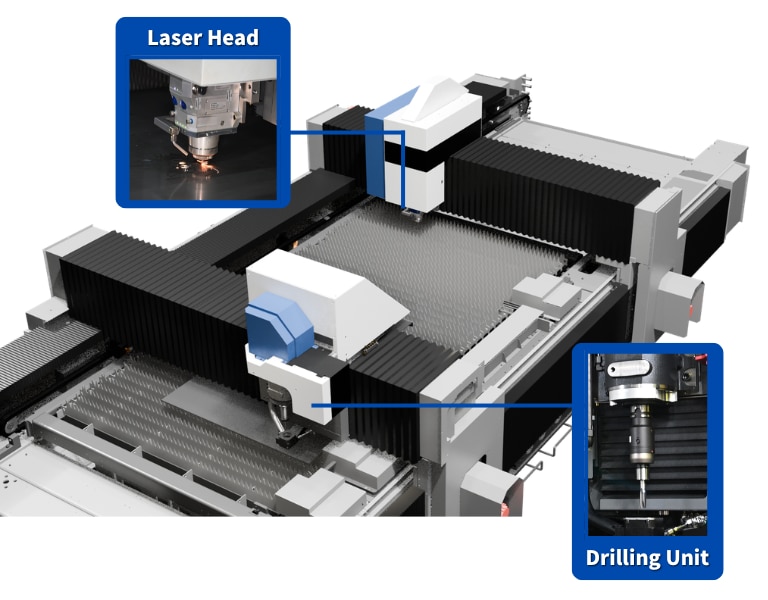 It features a compact layout that integrates two processing units—one for laser cutting and one for drilling—within the same space, minimizing installation space requirements.